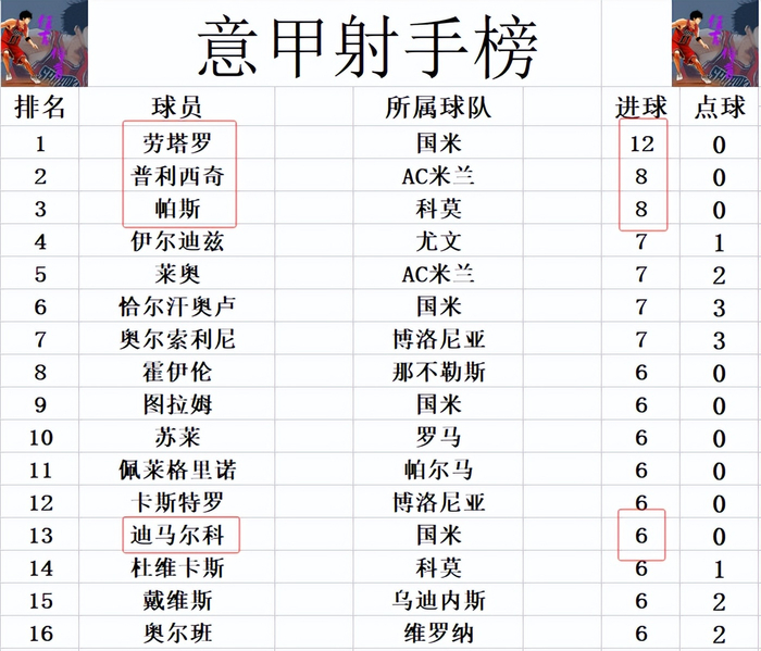 射手榜方面,劳塔罗今天又打入一球,12球继续领跑,比第2的普利西奇,帕斯多了4球。迪马尔科今天1射2传造3球,追上图拉姆,苏莱,霍伊伦等人6球刚好挤入前十。